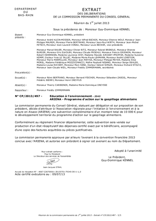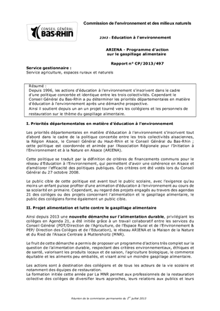 Depuis 1996, les actions d'éducation à l'environnement s'inscrivent dans le cadre d'une politique concertée et identique entre les trois collectivités. Cependant le Conseil Général du Bas-Rhin a pu déterminer les priorités départementales en matière d'éducation à l'environnement après une démarche prospective. Ainsi il soutient depuis un an un projet tourné vers les collégiens et les personnels de restauration sur le thème du gaspillage alimentaire.