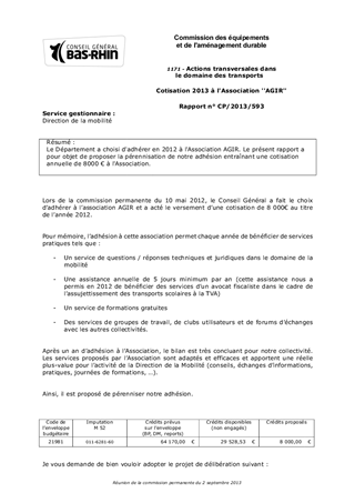 Le Département a choisi d'adhérer en 2012 à l'Association AGIR. Le présent rapport a pour objet de proposer la pérennisation de notre adhésion entraînant une cotisation annuelle de 8000 € à l'Association.