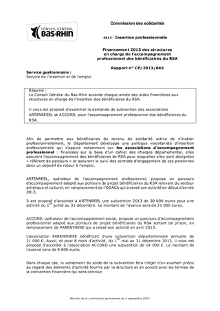Le Conseil Général du Bas-Rhin accorde chaque année des aides financières aux structures en charge de l'insertion des bénéficiaires du RSA. Il vous est proposé d'examiner la demande de subvention des associations ARTENREEEL et ACCORD, pour l'accompagnement professionnel des bénéficiaires du RSA.
