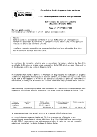 Dans le cadre des contrats de territoire et en vue de favoriser un aménagement harmonieux et durable du territoire, le Conseil Général a adopté une priorité partagée relative aux enjeux de centralité urbaine. Le présent rapport a pour objet de proposer l'attribution d'une subvention à ce titre, pour le territoire du Pays de Sainte Odile.