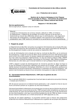 Le projet de réintroduction de la tortue cistude a débuté en 1990, à l'initiative du Département. L'objectif est de protéger les milieux naturels et de favoriser la biodiversité au travers des différentes actions pour la réintroduction, mais également des travaux de renaturations. Le présent rapport vise à poursuivre les modalités de collaboration avec l'ONF relative à l'entretien et la surveillance du site de Lauterbourg.