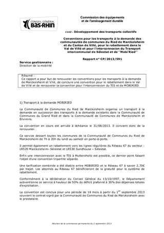 Ce rapport a pour but de renouveler les conventions pour les transports à la demande de Marckolsheim et Villé, de conclure une convention pour le rabattement dans le Val de Villé et de renouveler la convention pour l'interconnexion du TIS et de MOBIRIED.