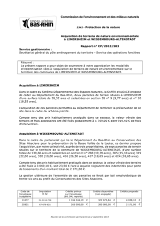 Le présent rapport a pour objet de soumettre à votre approbation les modalités d'indemnisation liées à l'acquisition de terrains de nature environnementale sur le territoire des communes de LIMERSHEIM et WISSEMBOURG-ALTENSTADT.