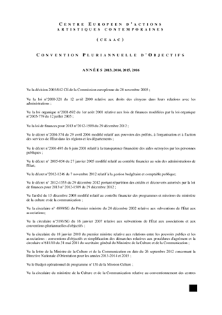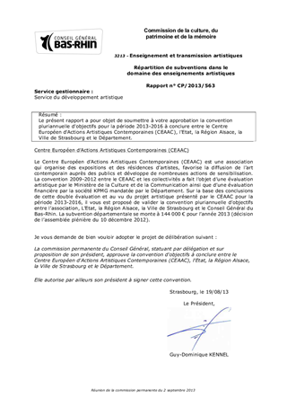 Le présent rapport a pour objet de soumettre à votre approbation la convention pluriannuelle d'objectifs pour la période 2013-2016 à conclure entre le Centre Européen d'Actions Artistiques Contemporaines (CEAAC), l'Etat, la Région Alsace, la Ville de Strasbourg et le Département.