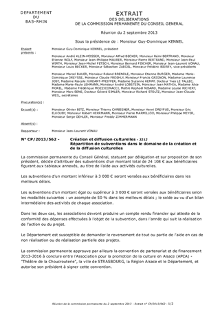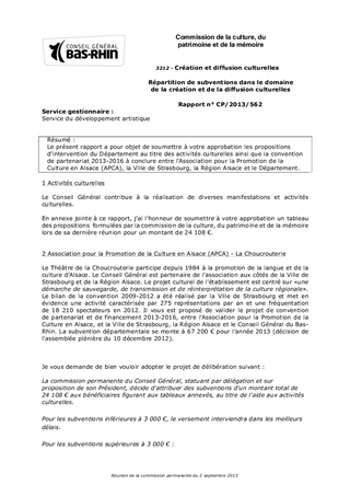 Le présent rapport a pour objet de soumettre à votre approbation les propositions d'intervention du Département au titre des activités culturelles ainsi que la convention de partenariat 2013-2016 à conclure entre l'Association pour la Promotion de la Culture en Alsace (APCA), la Ville de Strasbourg, la Région Alsace et le Département.