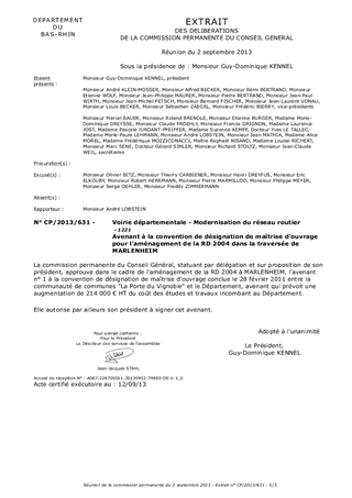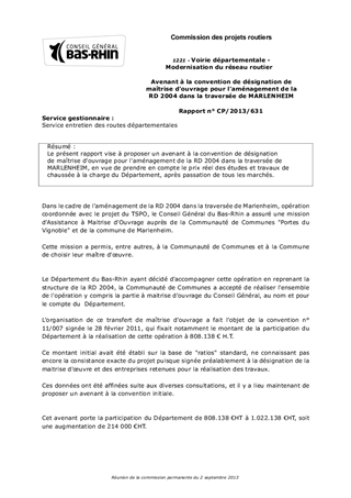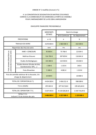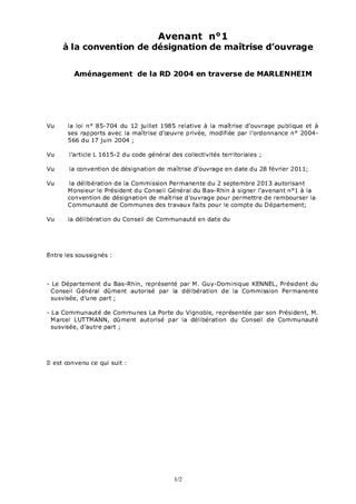 Le présent rapport vise à proposer un avenant à la convention de désignation de maîtrise d'ouvrage pour l'aménagement de la RD 2004 dans la traversée de MARLENHEIM, en vue de prendre en compte le prix réel des études et travaux de chaussée à la charge du Département, après passation de tous les marchés.