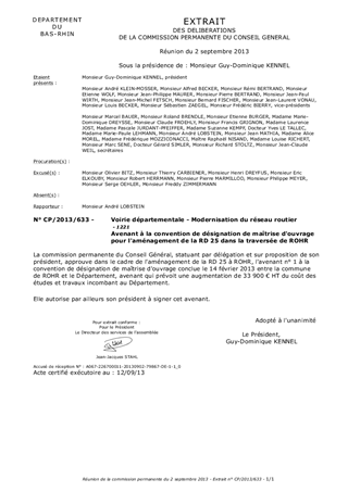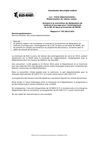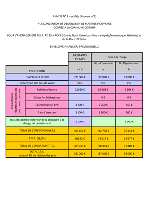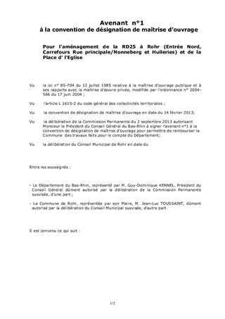Le présent rapport vise à proposer un avenant à la convention de désignation de maîtrise d'ouvrage pour l'aménagement de la RD 25 dans la traversée de ROHR, afin de prendre en compte une extension du programme des travaux, consentie dans le cadre du contrat de territoire.