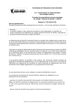Le présent rapport a pour objet de soumettre à votre approbation le transfert du terrain d'assiette et de bâtiments du collège 'Charles De Gaulle' de SELTZ, propriété du Syndicat Intercommunal de la région de SELTZ.
