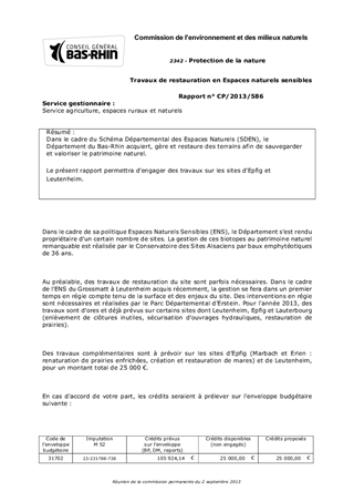 Dans le cadre du Schéma Départemental des Espaces Naturels (SDEN), le Département du Bas-Rhin acquiert, gère et restaure des terrains afin de sauvegarder et valoriser le patrimoine naturel. Le présent rapport permettra d'engager des travaux sur les sites d'Epfig et Leutenheim.