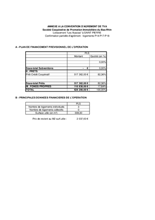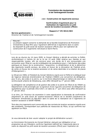 Le présent rapport concerne la demande de la Société Coopérative de Promotion Immobilière du Bas-Rhin pour l'agrément définitif de 3 logements dans le cadre du dispositif du prêt social de location-accession (PSLA) pour son opération de construction de 5 logements individuels à Saint-Pierre.