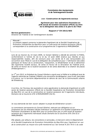 Le présent rapport concerne la demande d'agrément de la Société Coopérative de Promotion Immobilière du Bas-Rhin pour un prêt social de location-accession (PSLA) correspondant à la construction d'un programme de 5 logements à MARLENHEIM.