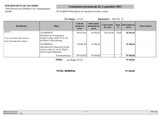 Le présent rapport concerne la demande d'aide financière présentée par l'OPUS 67 pour la démolition de 36 logements collectifs dans le cadre de la délégation des aides à la pierre de l'Etat et du dispositif départemental d'aide à la démolition de logements locatifs sociaux. A ce titre, 2 dossiers relatifs à des opérations de démolition de 30 logements collectifs à Wissembourg et 30 logements collectifs à Haguenau sont présentés dans l'annexe au rapport.