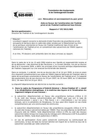 Le présent rapport concerne la demande d'aide financière de propriétaires privés occupants et bailleurs dans le cadre des aides versées par le Département au titre de sa politique volontariste en faveur de l'habitat traditionnel bas-rhinois et de l'amélioration de l'habitat privé, en complément des subventions de l'ANAH (agence nationale de l'habitat). A ce titre, 79 dossiers sont présentés dans les deux annexes au rapport.