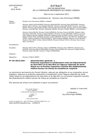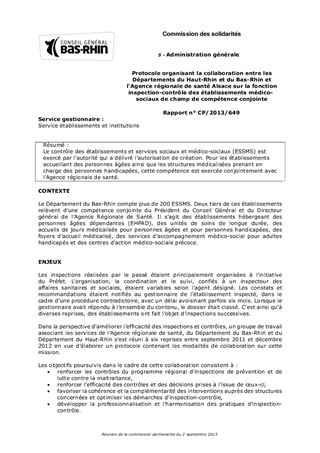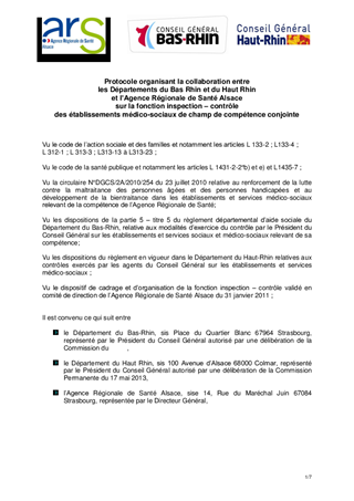 Protocole organisant la collaboration entre les Départements du Haut-Rhin et du Bas-Rhin et l'Agence régionale de santé Alsace sur la fonction inspection-contrôle des établissements médico-sociaux de champ de compétence conjointe