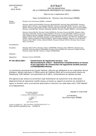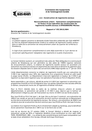 Le présent rapport concerne la demande d'aide financière présentée par CUS HABITAT au titre du dispositif départemental d'aide à la création de logements locatifs sociaux dans le cadre de la convention de renouvellement urbain du quartier de la Meinau à Strasbourg. Il s'agit d'une subvention complémentaire à celle déjà examinée le 3 juin dernier et concernant spécifiquement l'adaptation des logements à la perte d'autonomie.
