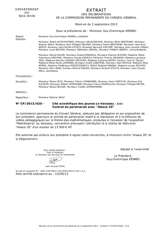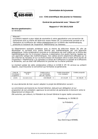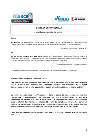 Le présent rapport a pour objet de soumettre à votre approbation une convention de partenariat avec la chaîne de télévision locale Alsace 20. Ce partenariat consiste en la réalisation et la diffusion de vidéos pédagogiques sur le thème des mathématiques, produites à l'occasion de l'exposition 'Mathémanip' au Vaisseau.