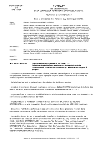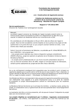 Le présent rapport concerne les résultats de l'appel à projets conjoint entre la Communauté urbaine de Strasbourg (CUS) et le Département du Bas-Rhin pour susciter la création de résidences seniors sur le territoire de la CUS. Dix candidatures ont été déposées le 28 juin 2013, date de clôture de l'appel à projets. Neuf ont été considérées comme éligibles et leurs porteurs de projet ont été auditionnés le 15 juillet 2013 par un jury conjoint (Conseil Général et CUS) ; l'une d'entre elles n'était pas recevable. Suite à l'avis de la Commission de Sélection, co-présidée par M. Alfred BECKER et M. Henri DREYFUS, il est proposé que : - trois projets soient labélisés sous réserve d'apporter quelques compléments (MARPA d'Eschau, projet de Lipsheim et opération de la Fondation Armée du Salut à Strasbourg-Neuhof) - six projets soient présélectionnés en vue d'une nouvelle présentation devant le Jury au mois de novembre 2013. En effet, malgré un concept original et intéressant, certains points substantiels du projet doivent être mieux identifiés.
