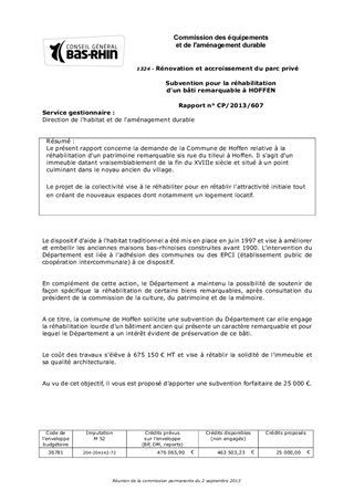 Le présent rapport concerne la demande de la Commune de Hoffen relative à la réhabilitation d'un patrimoine remarquable sis rue du tilleul à Hoffen. Il s'agit d'un immeuble datant vraisemblablement de la fin du XVIIIe siècle et situé à un point culminant dans le noyau ancien du village. Le projet de la collectivité vise à le réhabiliter pour en rétablir l'attractivité initiale tout en créant de nouveaux espaces dont notamment un logement locatif.