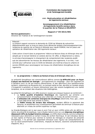 Le présent rapport concerne la demande du CCAS de Sélestat de subvention départementale pour la mise en place d'une démarche globale d'accompagnement des locataires du quartier de la Filature à Sélestat pour lequel DOMIAL met en place une opération de réhabilitation des 106 logements sociaux. Cette action s'inscrit dans le programme 'réduire sa facture d'eau et d'énergie chez soi' adopté par le Conseil Général en octobre dernier. En effet, le Département a retenu le principe d'accompagner le changement de comportement des locataires plutôt que de subventionner les travaux de réhabilitation des logements. A ce titre, il est sollicité pour cofinancer avec le CCAS de Sélestat une maîtrise d'oeuvre urbaine et sociale (MOUS) pour accompagner les travaux de réhabilitation énergétique de ces logements.
