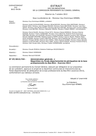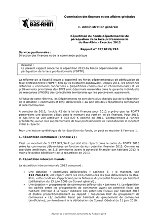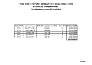Répartition du Fonds départemental de péréquation de la taxe professionnelle du Bas-Rhin - Exercice 2013 Resumé Le présent rapport concerne la répartition 2013 du Fonds départemental de péréquation de la taxe professionnelle (FDPTP). Pièces jointes Délibération Rapport Annexe 1 Annexe 2 Annexe 3 Annexe 4 Assemblée : Commission Permanente Date : 07/10/2013 Rapporteur : Monsieur Bernard FISCHER Collectivité : Conseil départemental du Bas-Rhin Direction : Pôle ressources Service : Direction des finances et de la commande publique Domaine : Non renseigné Commission : M - Commission des finances et des affaires générales