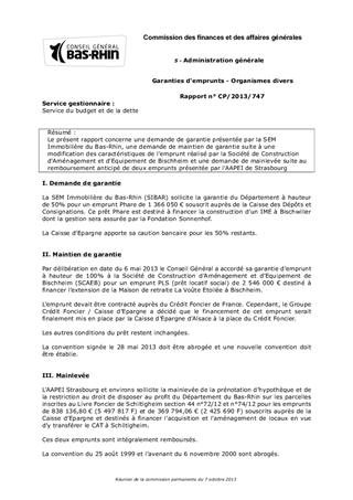 Le présent rapport concerne une demande de garantie présentée par la SEM Immobilière du Bas-Rhin, une demande de maintien de garantie suite à une modification des caractéristiques de l'emprunt réalisé par la Société de Construction d'Aménagement et d'Equipement de Bischheim et une demande de mainlevée suite au remboursement anticipé de deux emprunts présentée par l'AAPEI de Strasbourg