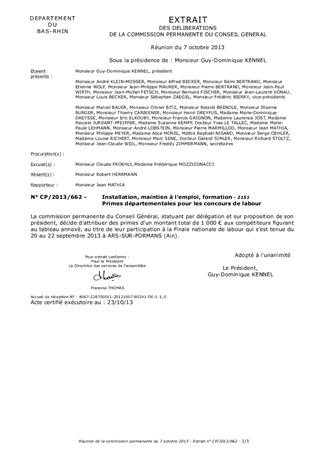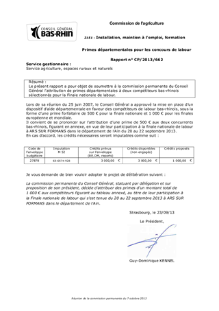 Le présent rapport a pour objet de soumettre à la commission permanente du Conseil Général l'attribution de primes départementales à deux compétiteurs bas-rhinois sélectionnés pour la Finale nationale de labour.