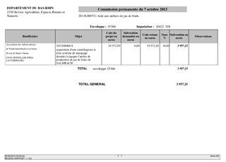 Le présent rapport a pour objet de soumettre à la commission permanente du Conseil Général l'attribution d'aides départementales au titre de : - l'aménagement et l'équipement d'ateliers de production artisanale de jus de fruits - l'ouverture de la mesure agro-environnementale en faveur de la protection de la race bovine vosgienne - l'allègement des primes d'assurance garantissant les cultures houblonnières contre les risques de grêle et de tempête