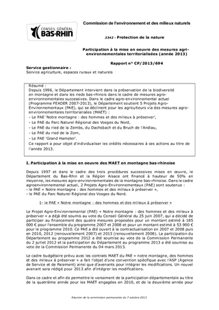 Depuis 1996, le Département intervient dans la préservation de la biodiversité en montagne et dans les rieds bas-rhinois dans le cadre de mesures agro-environnementales successives. Dans le cadre agro-environnemental actuel (Programme FEADER 2007-2013), le Département soutient 5 Projets Agro-Environnementaux (PAE), qui se déclinent pour les agriculteurs via des mesures agro-environnementales territorialisées (MAET) : - Le PAE 'Notre montagne : des hommes et des milieux à préserver', - Le PAE du Parc Naturel Régional des Vosges du Nord, - Le PAE du ried de la Zembs, du Dachsbach et du Bruch de l'Andlau, - Le PAE du ried de la Zorn, - Le PAE 'Grand Hamster'. Ce rapport a pour objet d'individualiser les crédits nécessaires à ces actions au titre de l'année 2013.