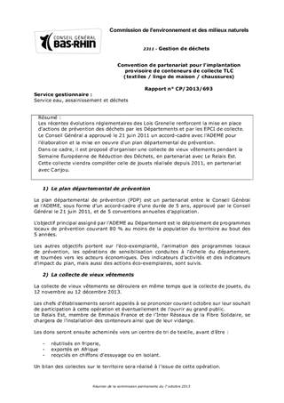 Les récentes évolutions réglementaires des Lois Grenelle renforcent la mise en place d'actions de prévention des déchets par les Départements et par les EPCI de collecte. Le Conseil Général a approuvé le 21 juin 2011 un accord-cadre avec l'ADEME pour l'élaboration et la mise en oeuvre d'un plan départemental de prévention. Dans ce cadre, il est proposé d'organiser une collecte de vieux vêtements pendant la Semaine Européenne de Réduction des Déchets, en partenariat avec Le Relais Est. Cette collecte viendra compléter celle de jouets réalisée depuis 2011, en partenariat avec Carijou.