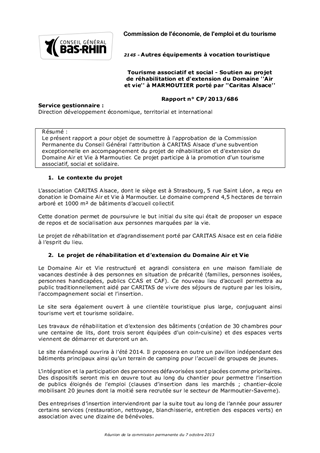 Le présent rapport a pour objet de soumettre à l'approbation de la Commission Permanente du Conseil Général l'attribution à CARITAS Alsace d'une subvention exceptionnelle en accompagnement du projet de réhabilitation et d'extension du Domaine Air et Vie à Marmoutier. Ce projet participe à la promotion d'un tourisme associatif, social et solidaire.
