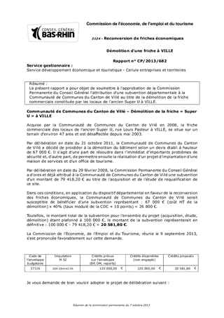 Le présent rapport a pour objet de soumettre à l'approbation de la Commission Permanente du Conseil Général l'attribution d'une subvention départementale à la Communauté de Communes du Canton de Villé au titre de la démolition de la friche commerciale constituée par les locaux de l'ancien Super U à VILLE.