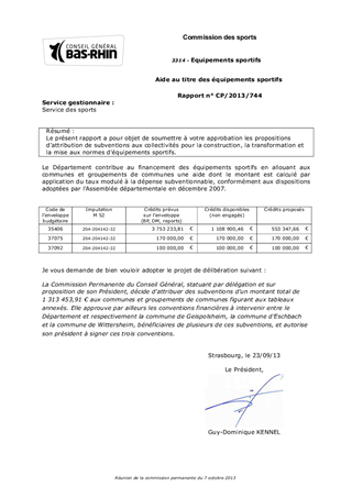 Le présent rapport a pour objet de soumettre à votre approbation les propositions d'attribution de subventions aux collectivités pour la construction, la transformation et la mise aux normes d'équipements sportifs.