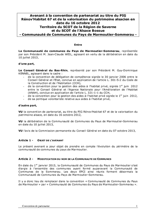Le présent rapport concerne la mise en place d'une convention de partenariat avec la communauté de communes de Benfeld et Environs, et d'un avenant à la convention de partenariat avec la communauté de communes du Pays de Marmoutier-Sommerau dans le cadre de la politique départementale en faveur de l'habitat traditionnel bas-rhinois et du programme d'intérêt général (PIG) Rénov'Habitat 67.