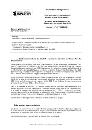 Le présent rapport soumet à votre approbation : - le soutien au centre socioculturel du Neuhof pour la reprise des activités sur le quartier du Ziegelwasser - le soutien à des associations socioéducatives - le soutien à des actions phares dans le cadre des CTJ.