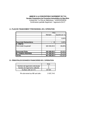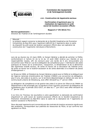 Le présent rapport concerne la demande de la Société Coopérative de Promotion Immobilière du Bas-Rhin pour l'agrément définitif de 2 logements dans le cadre du dispositif du prêt social de location-accession (PSLA) pour son opération de construction de 7 logements individuels à Marlenheim.