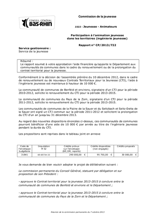 Le rapport soumet à votre approbation l'aide financière qu'apporte le Département aux communautés de communes dans le cadre du renouvellement ou de la prolongation du contrat territorial pour la jeunesse.
