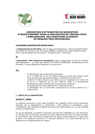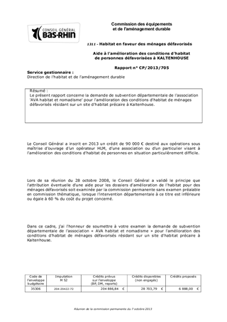 Le présent rapport concerne la demande de subvention départementale de l'association 'AVA habitat et nomadisme' pour l'amélioration des conditions d'habitat de ménages défavorisés résidant sur un site d'habitat précaire à Kaltenhouse.