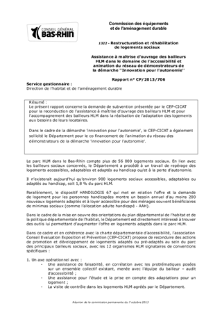 Le présent rapport concerne la demande de subvention présentée par le CEP-CICAT pour la reconduction de l'assistance à maîtrise d'ouvrage des bailleurs HLM et pour l'accompagnement des bailleurs HLM dans la réalisation de l'adaptation des logements aux besoins de leurs locataires. Dans le cadre de la démarche 'innovation pour l'autonomie', le CEP-CICAT a également sollicité le Département pour le co financement de l'animation du réseau des démonstrateurs de la démarche 'innovation pour l'autonomie'.
