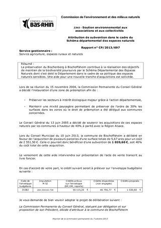 La préservation du Bischenberg à Bischoffsheim contribue à la réalisation des objectifs de maintien de la biodiversité poursuivis par le Schéma Départemental des Espaces Naturels dont s'est doté le Département dans le cadre de sa politique des espaces naturels sensibles. Une aide pour une nouvelle tranche d'acquisitions est sollicitée.