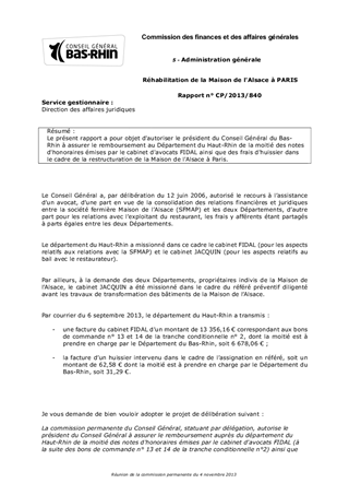 Le présent rapport a pour objet d'autoriser le président du Conseil Général du Bas-Rhin à assurer le remboursement au Département du Haut-Rhin de la moitié des notes d'honoraires émises par le cabinet d'avocats FIDAL ainsi que des frais d'huissier dans le cadre de la restructuration de la Maison de l'Alsace à Paris.
