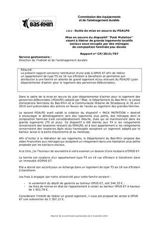 Le présent rapport concerne l'attribution d'une aide à OPUS 67 afin de libérer un appartement de type T5 sis 16 rue d'Erstein à Gerstheim et permettre son attribution à une famille en attente de grand logement et/ou relevant du PDALPD (plan départemental d'action pour le logement des personnes défavorisées).