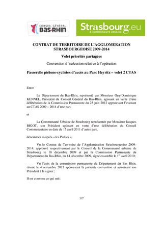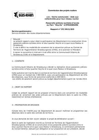 Le présent rapport a pour objet la participation du Département à la construction d'une passerelle piétons-cyclistes entre le futur quartier Heyritz et le quai Louis Pasteur à Strasbourg. Il vise à définir les modalités de versement de la subvention prévue au Contrat de Territoire de l'Agglomération Strasbourgeoise (CTAS), et à autoriser le Président à signer la convention à intervenir à cet effet entre la Communauté Urbaine de Strasbourg (CUS) et le Département.
