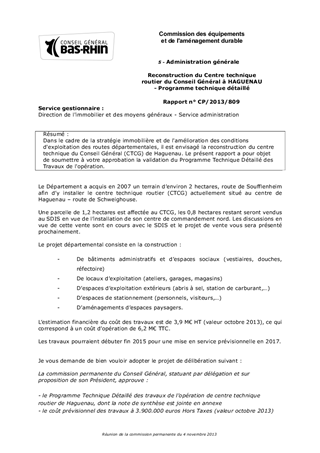 Dans le cadre de la stratégie immobilière et de l'amélioration des conditions d'exploitation des routes départementales, il est envisagé la reconstruction du centre technique du Conseil Général (CTCG) de Haguenau. Le présent rapport a pour objet de soumettre à votre approbation la validation du Programme Technique Détaillé des Travaux de l'opération.