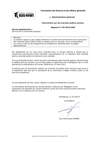 Le présent rapport a pour objet d'informer la commission permanente de la conclusion des marchés publics décrits dans le tableau joint en annexe, et qui correspondent à la mise en oeuvre de programmes et d'opérations identifiés dans le budget départemental.