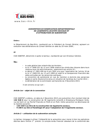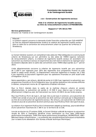 Le présent rapport concerne la demande d'aide financière présentée par CUS-HABITAT au titre du dispositif départemental d'aide à la création de logements locatifs sociaux dans le cadre de la convention de renouvellement urbain du quartier de la Meinau à Strasbourg.