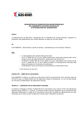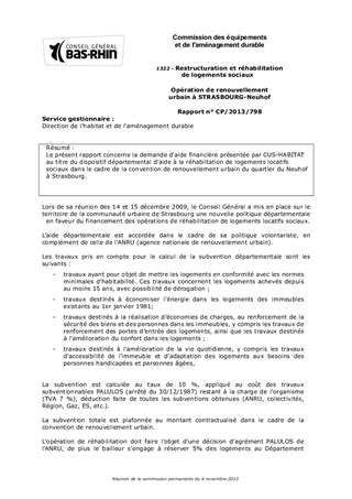 Le présent rapport concerne la demande d'aide financière présentée par CUS-HABITAT au titre du dispositif départemental d'aide à la réhabiltation de logements locatifs sociaux dans le cadre de la convention de renouvellement urbain du quartier du Neuhof à Strasbourg.