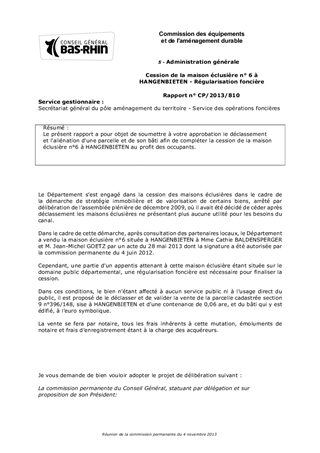 Le présent rapport a pour objet de soumettre à votre approbation le déclassement et l'aliénation d'une parcelle et de son bâti afin de compléter la cession de la maison éclusière n°6 à HANGENBIETEN au profit des occupants.