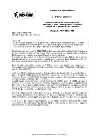 La convention de partenariat avec la ville de STRASBOURG concerne le financement d'un dispositif de logements temporaires pour l'hébergement d'urgence de familles avec enfants de moins de 3 ans au titre de la protection de l'enfance.