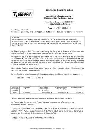 Le présent rapport a pour objet de soumettre à votre approbation les modalités d'indemnisation d'une parcelle de terrain située dans l'emprise du canal de la Bruche sur le territoire de la commune de KOLBSHEIM, propriété de l'Association Foncière de DUPPIGHEIM.