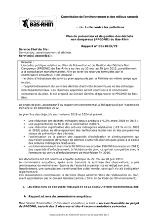 L'enquête publique relative au Plan de Prévention et de Gestion des Déchets Non Dangereux (PPGDND) du Bas-Rhin a eu lieu du 22 mai au 28 juin 2013, parallèlement à la consultation transfrontalière. Afin de lever les réserves formulées par le commissaire enquêteur, il est proposé : - le choix d'indicateurs de suivi du plan approuvés par la Plénière en même temps que le plan, - l'approfondissement du suivi des déchets d'activités économiques et des échanges interdépartementaux. Les réponses apportées seront soumises à la commission consultative du plan. Il est proposé au Conseil Général d'approuver le PPGDND du Bas-Rhin.